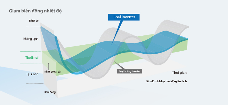 Máy điều hòa không khí inverter điều chỉnh công suất dựa vào tải nhiệt, giảm thiểu cách biệt giữa nhiệt độ phòng và nhiệt độ cài đặt, mang lại sự thoải mái cao hơn so với máy không inverter.